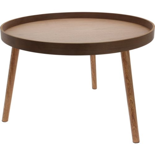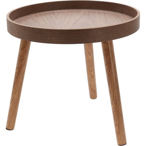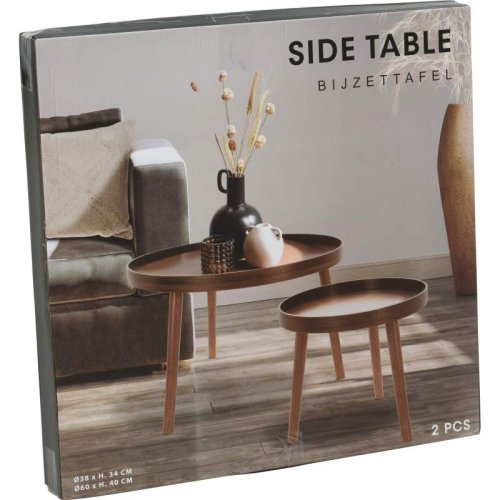 Stylová sada dvou kulatých odkládacích stolků na třech nohách v elegantní barvě tmavého ořechu. Stoly mají nohy z borového dřeva potažené PV fólií a desky z MDF s ořechovou dýhou, což zaručuje dlouhou životnost a luxusní vzhled.