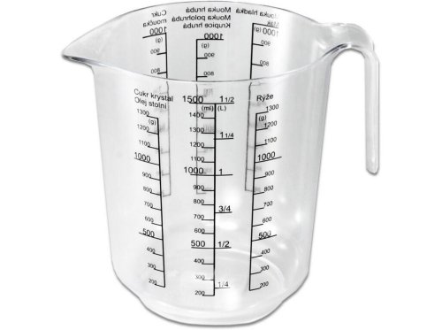 Tato plastová odměrka má měrný objem až 1500 ml. Rozměr odměrky: průměr 13cm a výška 16 cm. Je opatřena stupnicí na mouku hrubou, polohrubou a hladkou, rýži, cukr moučku, cukr krystal, mák, olej a vodu. Český výrobce. EAN 8590474908701