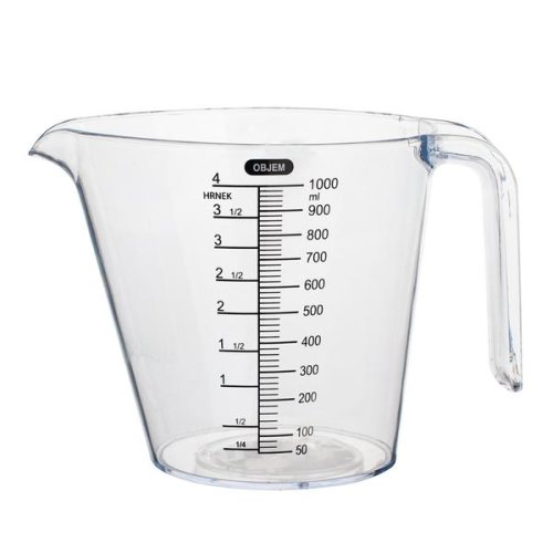 Objem měření 1 litr, výška odměrky 13 cm. Na odměrce je vytištěna dobře čitelná stupnice na tekutiny, gramy. EAN 8591177107316