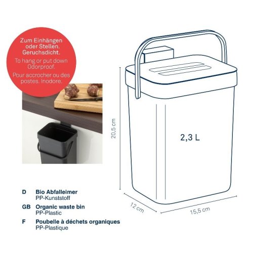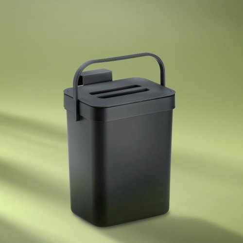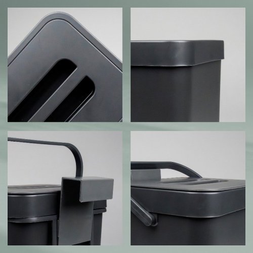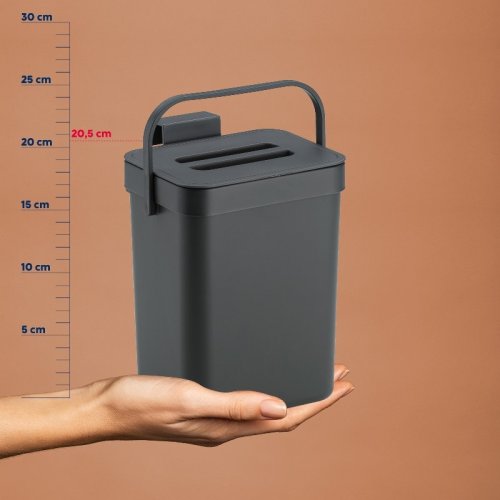 Malý organický odpadkový koš v tmavě šedé barvě je dokonalým kuchyňským pomocníkem pro každého, kdo oceňuje úsporu místa a funkčnost. Tento praktický plastový koš je ideální na organický odpad a lze jej snadno zavěsit na zásuvky, aby byl vždy blízko vaší pracovní plochy.