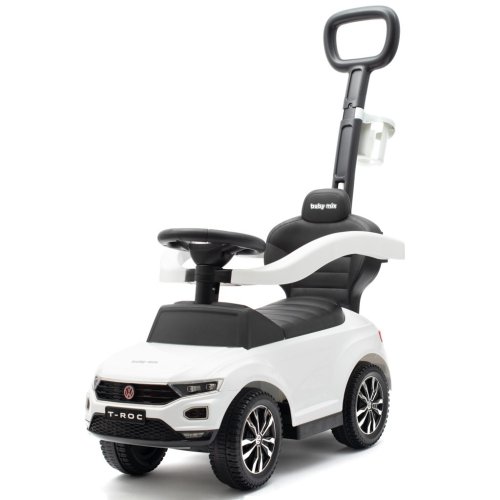 Dětské odrážedlo s vodící tyčí VOLKSWAGEN T-ROC je vyrobeno v licenci koncernu Volkswagen. Váš malý závodník či závodnice se v něm bude cítit jako v opravdovém bouráku. Odrážedlo je vyrobeno s důrazem na každý detail a kvalitu použitých materiálů. Jeho sportovní vzhled upoutá pozornost nejen každého dítěte, ale i rodiče. Odrážedlo pomáhá rozvíjet motorické schopnosti dítěte a zaručí mu spoustu zábavy a legrace. Autíčko má na volantu efektní houkačku a tlačítka s melodiemi. Je určeno jak pro nejmenší děti, které už umí sedět, tak i pro děti, které se už naučily chodit. Odrážedlo má široké a komfortní sedadlo s úložným prostorem, kvalitní plastová kola a pohodlnou a zároveň pevnou vodící tyč s držákem na nápoje, kterou lze odrážedlo řídit. Vodící tyč, opěrky na ruce a podnožky lze sundat a tím dítě využije autíčko jako klasické odrážedlo. Baterie nejsou součástí balení (2x AA 1.5V).