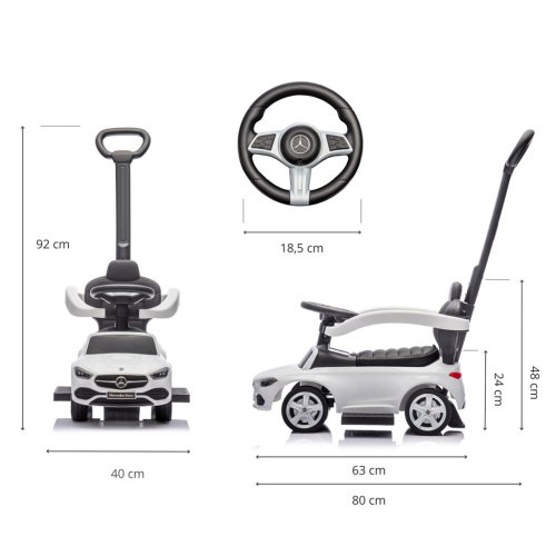 Realistický design inspirovaný modelem Mercedes C-Class zaujme detaily jako elegantní provedení, gumová kola, logo značky, volant se zvuky a "přístroje," což podporuje dětskou představivost a umožňuje kreativní hru.