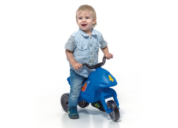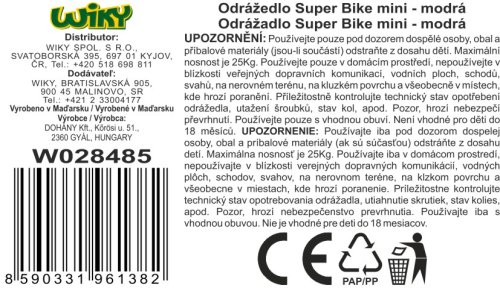 Odrážedlo Super Bike mini. Modrá barva. Rozměry - délka 57cm, šířka 28cm, výška 41cm. 3 kola. Max nosnost 25 Kg.