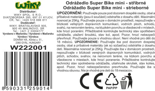 Odrážedlo Super Bike mini. Stříbrná barva. Rozměry - délka 57cm, šířka 28cm, výška 41cm. 3 kola. Max nosnost 25 Kg.