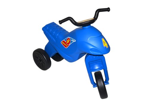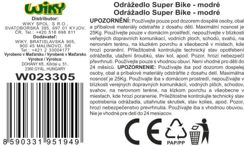 Odrážedlo Super Bike. Modrá barva. Délka 58cm, šířka 28cm, výška 44cm. 3 kola. Max nosnost 25 Kg.
