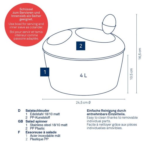 Miska o průměru 24,5 cm je nejen robustní a odolná, ale také všestranná. Můžete jej použít přímo k podávání vašich salátů, zatímco vnitřní sítko slouží jako praktický cedník.