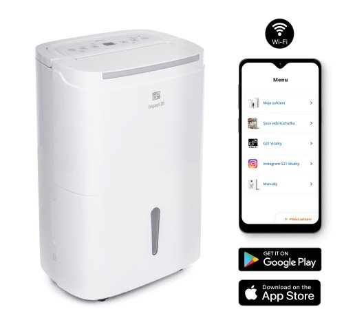 Odvlhčovač vzduchu G21 Impact 20 od české značky G21 má kapacitu 20 l za 24 hodin. Je vybaven 5l, dostatečně velkou nádržkou na kondenzát s průhledným indikátorem stavu. Pozorovat jej však ani nemusíte – odvlhčovač se při naplnění nádržky sám vypne. Odvlhčovač používá ekologické chladivo R290, které nepoškozuje ozónovou vrstvu.