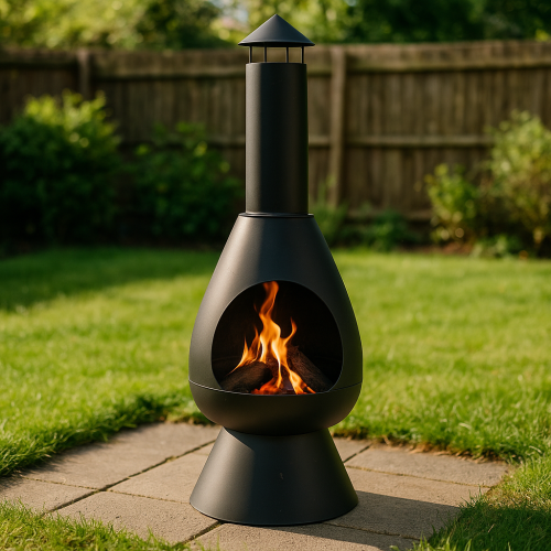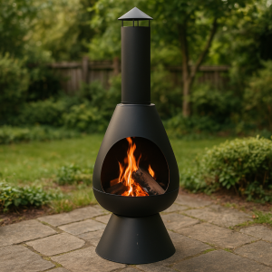 Stylový komínový krb z ohnivzdorného černého kovu je ideálním doplňkem pro venkovní posezení. Vytváří příjemnou atmosféru, poskytuje teplo a zároveň působí elegantně jako designový prvek zahrady či terasy.