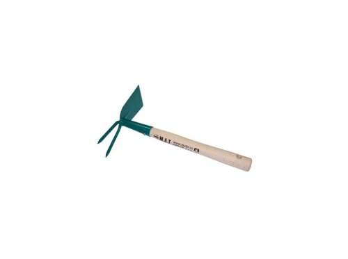 Ruční okopávačka se dvěma hroty pro odstraňování plevele a kypření půdy na zeleninovém záhonu okolo rostlin.