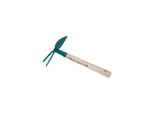 Ruční okopávačka ve tvaru srdíčka, se dvěma hroty pro odstraňování plevele a kypření půdy na zeleninovém záhonu okolo rostlin.