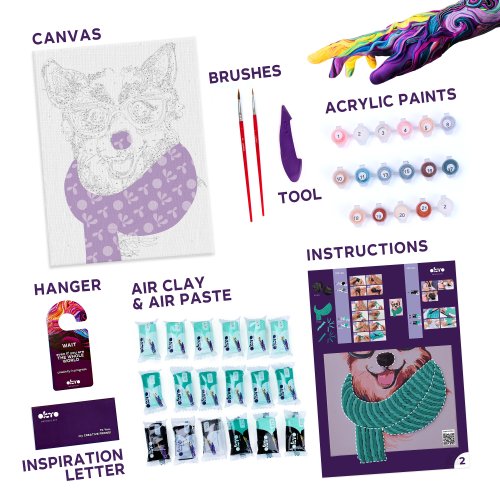 OKTO Malba a 3D modelování obraz "Fashion Corgi". Velikost plátna 30x40 cm. Vymalujte obrázek podle čísel a vytvarujte 3D prvek obrazu. Obsah balení - plátno, obrázkový návod, modelovací nástroj, Sada samoschnoucí modelovací hmoty, set barev na malování, štětec.