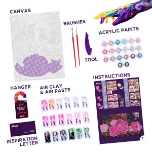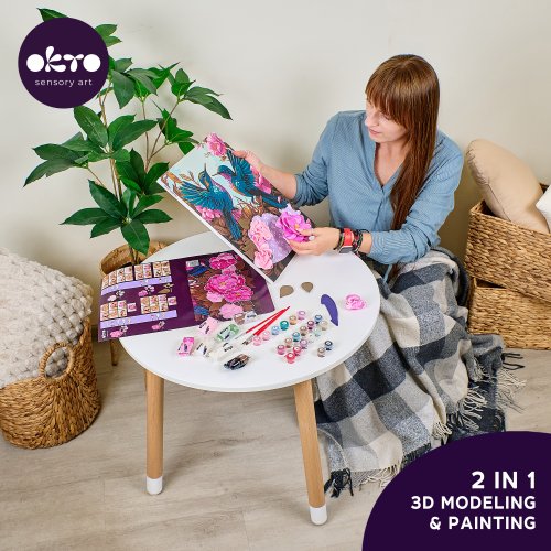 OKTO Malba a 3D modelování obraz "Hummingbirds in Love". Velikost plátna 30x40 cm. Vymalujte obrázek podle čísel a vytvarujte 3D prvek obrazu. Obtížnost 4/5. Obsah balení - plátno, obrázkový návod, modelovací nástroj, Sada samoschnoucí modelovací hmoty, set barev na malování, štětec.