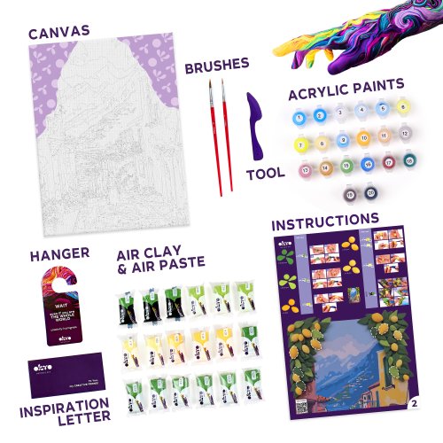OKTO Malba a 3D modelování obraz "Lemon Weekend". Velikost plátna 30x40 cm. Vymalujte obrázek podle čísel a vytvarujte 3D prvek obrazu. Obsah balení - plátno, obrázkový návod, modelovací nástroj, Sada samoschnoucí modelovací hmoty, set barev na malování, štětec.