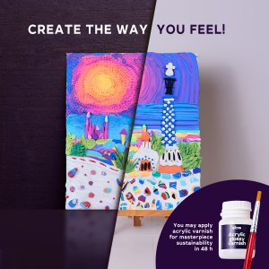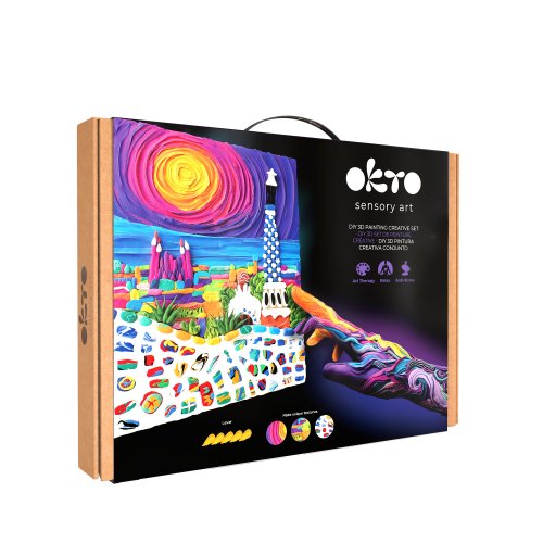 OKTO Malování hmotou motiv "#Park Guell - Barcelona". Velikost plátna 30x40 cm. Obtížnost 5/5. Obsah balení - přírodní plátno, obrázkový návod, modelovací nástroj, sada samoschnoucí modelovací hmoty, akrylový lak 20 ml, štětec.