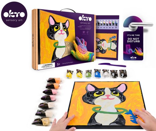 OKTO Malování hmotou podle čísel "Kočka". Velikost plátna 29x29 cm. Vytvarujte obrázek podle čísel. Obsah balení - rám, plátno, obrázkový návod, modelovací nástroj, sada barevných tvarovacích směsí 14 ks.