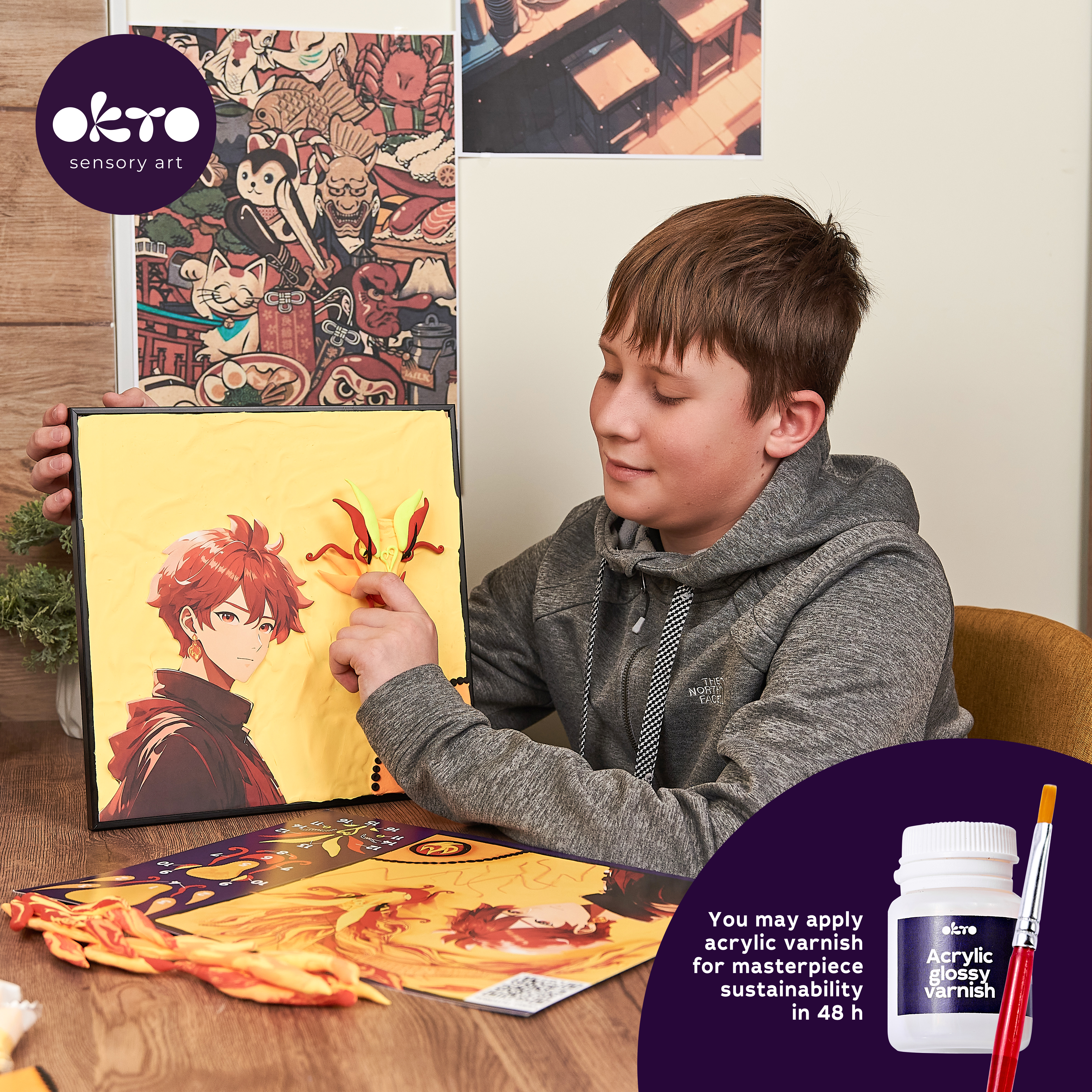 OKTO Manga motiv živlů "Oheň" výtvarný set. Velikost rámu 30x40 cm. Vytvarujte obrázek podle návodu. Obsah balení - rám, obrázkový návod, modelovací nástroj, sada samoschnoucí modelovací hmoty, akrylový lak 20 ml, štětec.