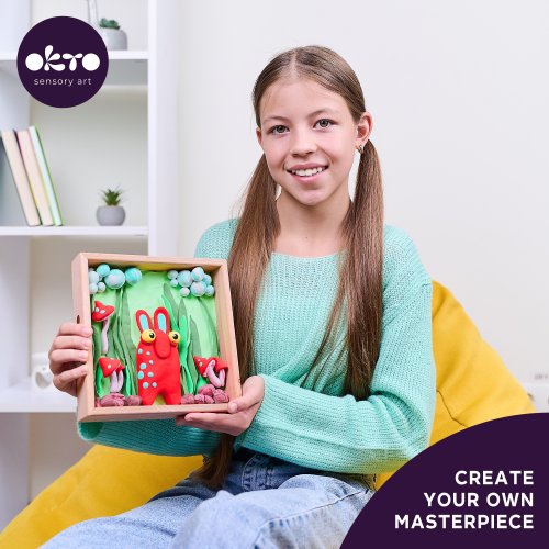 OKTO Modelování Malý svět v rámečku motiv "Skřítek". Velikost rámu 21x21 cm. Vytvarujte 3D scénu podle návodu. Obsah balení - dřevěný rám, obrázkový návod, dřevěný modelovací nástroj, sada samoschnoucí modelovací hmoty, akrylový lak 20 ml, štětec.