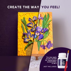OKTO SENSOTY ART výtvarná sada ”Kosatce”. Motiv malba Kosatce od malíře Vincenta van Gogha. Samotvrdnoucí hmota (air clay), malování prsty. Velikost plátna 30x40 cm. Obsah balení - plátno, obrázkový návod, tvarovací nástroj, samotvrdnoucí hmota.