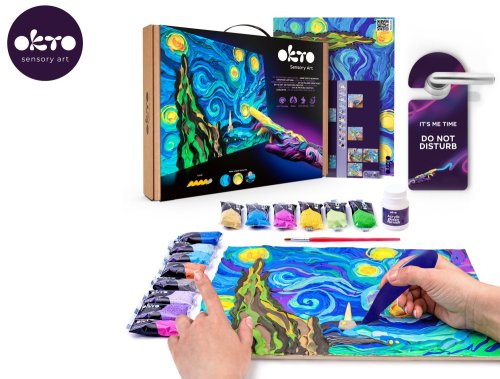 OKTO výtvarná sada ”Hvězdná noc”. Motiv malba Hvězdná noc od malíře Vincenta van Gogha. Úroveň obtížnosti 4/5. Samotvrdnoucí hmota (air clay), malování prsty. Velikost plátna 30x40 cm. Obsah balení - plátno, obrázkový návod, tvarovací nástroj, samotvrdnoucí hmota.
