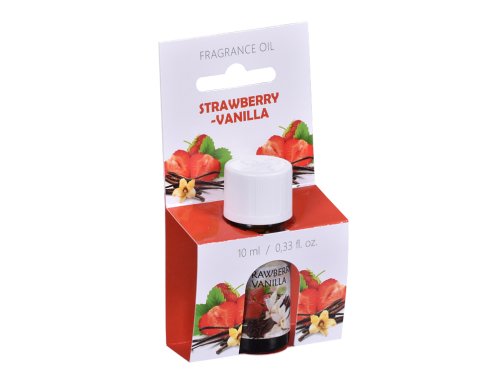 Éterický olej vhodný do aromalamp s vůní čerstvých jahod s vanilkou. Olej je ve skleněné lahvičce s bezpečnostním plastovým uzávěrem a s potiskem s jahodama s jahodovými listy a s vanilkovými lusky. Lahvička má objem 10 ml s rozměry d 2,5 cm x v. 7,7 cm.