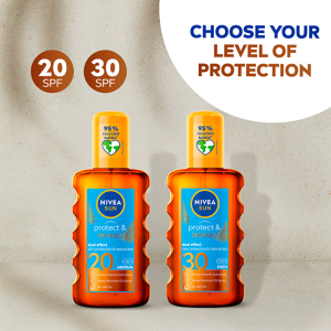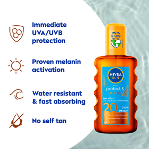 Hedvábný voděodolný olej na opalování ve spreji podporující zhnědnutí.