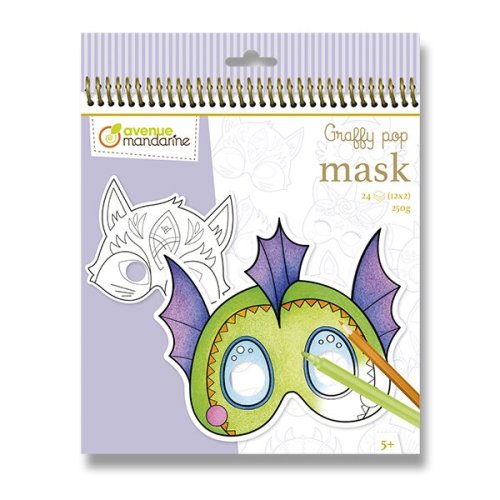 Omalovánky Avenue Mandarine Graffy Pop Mask s vyřezanými a předkreslenými motivy masek pohádkových zvířat. Omalovánky obsahují 24 listů, 12 motivů po 2 ks. Gramáž 250 g. Lze použít na všechny techniky - pastelky, fixy, akvarel atd. Vhodné pro děti od 5 let,,Rozměry balení: 20 x 25,5 cm.
