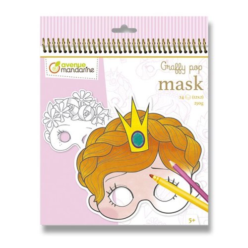 Omalovánky Avenue Mandarine Graffy Pop Mask s vyřezanými a předkreslenými motivy masek. Omalovánky obsahují 24 listů, 12 motivů po 2 ks. Gramáž 250 g. Lze použít na všechny techniky - pastelky, fixy, akvarel atd. Vhodné pro děti od 5 let,,Rozměry balení: 20 x 25,5 cm.