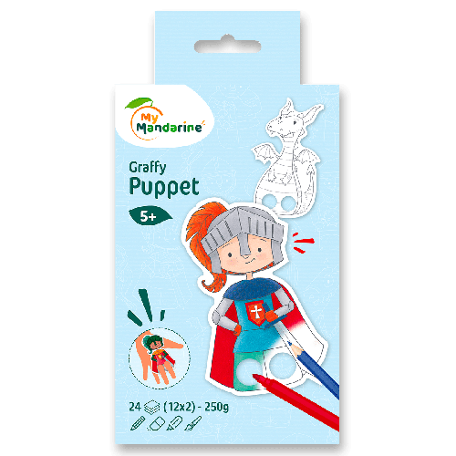 Omalovánky Avenue Mandarine Graffy Puppet s motivy draků a rytířů. Omalovánky předem připravené a upravené pro následné použití jako prstové loutky, stačí je vybarvit a hrát si. Omalovánky obsahují 24 listů, 12 motivů po 2 ks, kroužková vazba. Lze použít na techniky: pastelky, fixy, akvarel atd.