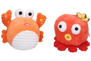 Opakovací zvířátko. Velikost 15cm. Stisknutím klepítka(krab), korunky(červená chobotnice), křídla(kuře) nebo čepice(modrá chobotnice) se spouští nahrávání a zvířátko rovnou opakuje co slyší. Dalším stiknutím se zapnou písničky, dalším opět nahrávání atd. Vypíná se on/off přepínačem uvnitř zvířátka. Zezadu má zip. 3xAAA baterie nejsou součástí. 4 varianty -krab, kuře, modrá chobotnice, červená chobotnice