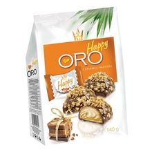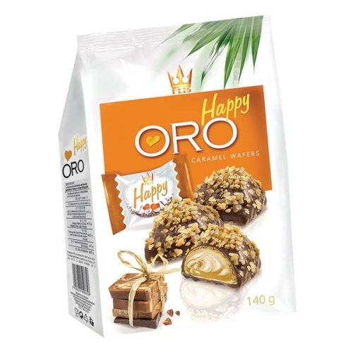 Křupavé oplatky Happy Oro s karamelovou náplní, zalité mléčnou čokoládou s karamelovými vločkami Složení: mléčnočokoladová poleva( cukr, kakaová máslo, sušené plnotučné mléko, kakaová hmota, sušená syrovátka, …