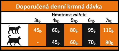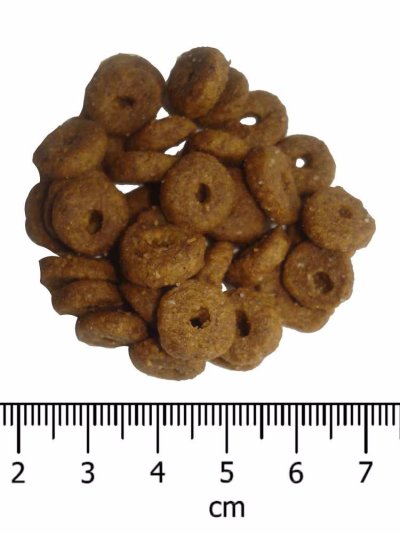 Analytické složky: Hrubý protein 31,5 %, hrubý olej a tuky 16,5 %, mastné kyseliny omega 6: 3 %, mastné kyseliny omega 3: 0,9 %, hrubá vláknina 2,3 %, celková dietní vláknina 6,5 %, hrubý popel 6,9 %, vápník 1,3 %, fosfor 1,1 %, vlhkost 9 %.