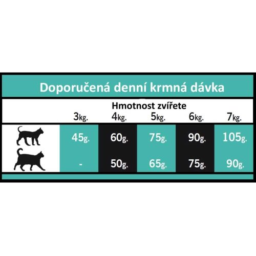Snadno stravitelné sacharidy, pro zajištění kvalitní srsti, kůže a podporu trávení. Obsah omega 3 a 6 esenciálních mastných kyselin pro správné fungování mozku a optimální kondici kardiovaskulárního systému. Obsah zinku napomáhá udržovat zdravou kůži a lesklou srst. FOS + MOS s prebiotickými účinky přispívá ke zdraví trávícího traktu.
