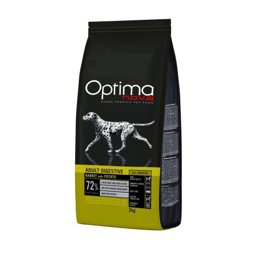 OPTIMAnova Dog Adult Digestive Rabbit & Potato GF kompletní krmivo bez obilovin, vyrobené z čerstvého králičího masa v kombinaci s kvalitní vepřovou bílkovinou a lehce stravitelnými sacharidy v kombinaci s prospěšnými tuky. Díky pečlivě vybranému složení poskytuje psovi všechny potřebné živiny, podporuje zdravé trávení a udržuje ideální kondici.