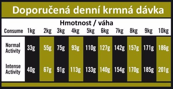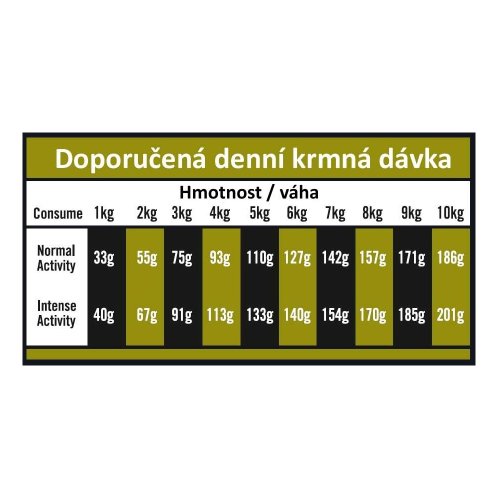 Analytické složky: hrubý protein 30 %, hrubý olej a tuky 18 %, EPA+DHA 400 mg / kg, Omega-3 mastné kyseliny 0,50 %, Omega-6 mastné kyseliny 1,45 %, hrubá vláknina 3,50 %, hrubý popel 7,5 %, vápník 1,70 %, fosfor 1,00 %. Metabolizovatelná energie: 3 947 kcal/kg.