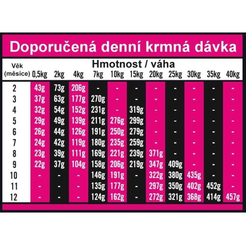 Analytické složky: Hrubý protein 29 %, hrubý olej a tuky 22 %, EPA+DHA 2.400 mg / kg, hrubá vláknina 2,70 %, hrubý popel 8 %, vápník 1,20 %, fosfor 1,05 %.