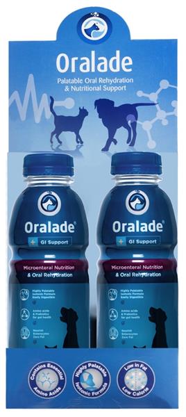 Doplňkové krmivo pro psy a kočky. Obsahuje esenciální aminokyseliny, elektrolyty, uhlohydráty a prebiotika. Snadná stravitelnost a prebiotika pomáhají podporovat zdraví a regeneraci střev. Roztok je připravený k okamžitému podání orálně nebo prostřednictvím řízeného krmení (sondou). Podávejte během období akutního průjmu a následné rekonvalescence. Oralade pomáhá při léčbě akutních střevních resorpčních onemocnění, při pankreatitidě i po operacích trávicího traktu. Hypoallergenní a žádné kontraindikace – vhodné pro pacienty s diabetem, alergiemi, ledvinovými i močovými problémy (nízký obsah fosforu). Vhodné i při péči o zdravá zvířata – během teplého počasí, cestování, po tréninku, po porodu. Přírodní kuřecí příchuť zaručuje vysokou chutnost pro psy i kočky. Složení: Demineralizovaná voda, dextróza monohydrát, chlorid sodný, chlorid draselný, dihydrogenfosforečnan sodný, hydrolyzovaná kuřecí játra. Analytické složky: Hrubý protein 1 %, hrubý tuk 0,1 %, hrubá vláknina 0,3 %, hrubý popel 0,5 %, vlhkost 96 %, draslík 0,08 %, sodík 0,14 %, chloridy 0,20 %, fosfor 0,027 %, vápník 0,006 %. 14 kcal na 100 ml. Doplňkové látky: xantanová guma 0,12 %, L-glutamová kyselina 0,19 %, glycin 0,4 %, galakto-oligosacharidy 0,1 %. Přírodní aroma. Krmný návod: Zkrmujte až 1-2 týdny při opětovném zavádění běžné stravy. Orální rehydratace: