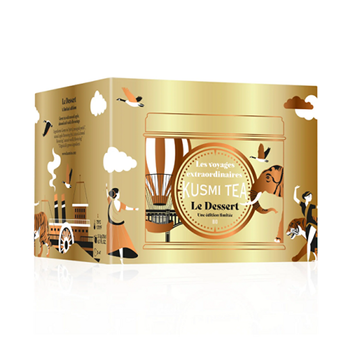 Originální bio organická čajová směs Kusmi Tea Le Dessert představuje jemný zelený čaj vonící uklidňujícími tóny doma pečeného koláče. V limitované edici ve vánočním designu dekorovaný motivy z románu Cesta kolem světa za 80 dní od Jula Verna.