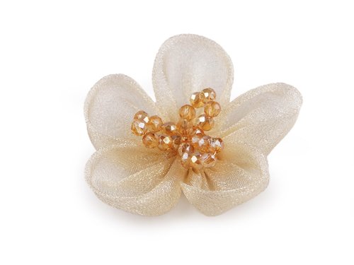 Romantický organzový květ s jemným třpytem je ve středu dozdobený propracovanými pestíky z broušených korálků. Díky nim se nádherně leskne. Květ má široké možnosti využití, působí nadýchaným vzhledem. Ve spodní části má textilní kolečko, pomocí kterého jej pohodlně kamkoliv upevníte. Dá se našít i nalepit. Použití: Květ můžete našít jako ozdobu na společenské šaty, halenky, trička nebo svetry. Je vhodný i na zdobení klobouků, čepic a čelenek do vlasů. Můžete ho také pomocí lepidla přilepit na brožový můstek a vytvořit zajímavý šperk.