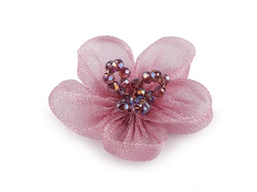 Romantický organzový květ s jemným třpytem je ve středu dozdobený propracovanými pestíky z broušených korálků. Díky nim se nádherně leskne. Květ má široké možnosti využití, působí nadýchaným vzhledem. Ve spodní části má textilní kolečko, pomocí kterého jej pohodlně kamkoliv upevníte. Dá se našít i nalepit. Použití: Květ můžete našít jako ozdobu na společenské šaty, halenky, trička nebo svetry. Je vhodný i na zdobení klobouků, čepic a čelenek do vlasů. Můžete ho také pomocí lepidla přilepit na brožový můstek a vytvořit zajímavý šperk.