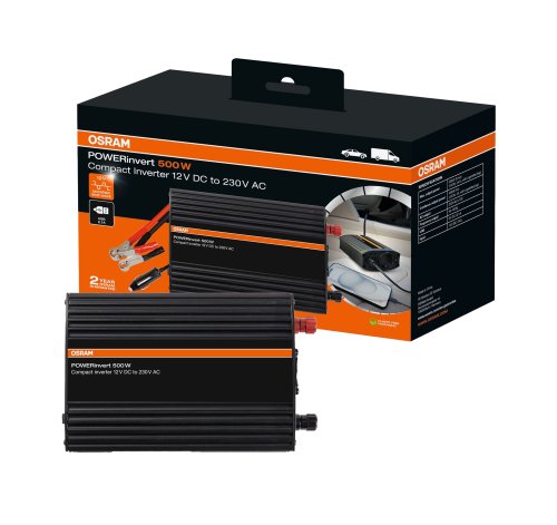 OSRAM POWERinvert s modifikovanou sinusovkou 12V DC 500 W je kompaktní řešení pro přeměnu 12V stejnosměrného proudu na 230V střídavý proud, které dodává síťové napájení přímo z automobilu. Tento invertor je ideální na služební cesty, výlety a dovolené a podporuje zařízení s výkonem až 500 W, jako jsou ledničky, vrtačky a počítače. Je vybaven vysoce výkonnou zásuvkou USB 2,1 A, která je ideální pro nabíjení chytrých telefonů a tabletů. Snadno se používá, stačí jej připojit k baterii pomocí přiložených svorek. Jeho kompaktní a lehká konstrukce zajišťuje pohodlné skladování a přenášení.