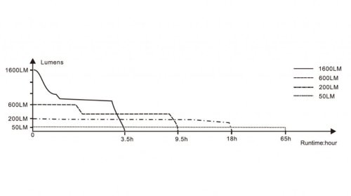 - Celkem pět režimů výkonu: 1600 lumenů (3,5 hodiny*) -> 600 lumenů (9,5 hodiny) -> 200 lumenů (18 hodin) -> 50 lumenů (65 hodin) -> blikání (pulzování mezi 50 a 600 lumeny).
