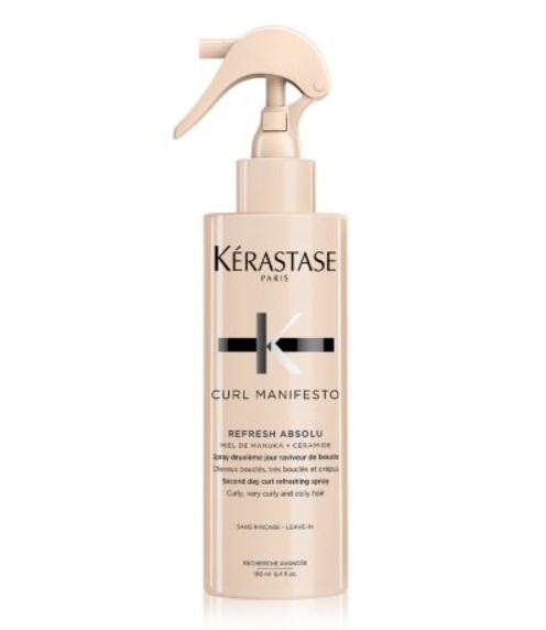 Lehká mlha ve spreji Kérastase Curl Manifesto Refresh Absolu Spray dodává vlasům okamžité osvěžení, hydrataci a reaktivuje tvar vlnitých a kudrnatých vlasů. Unikátní technologie obsahuje účinné ingredience jako jsou ceramidy a manukový med, které obnovují a posilují vnitřní strukturu slabých a křehkých vlasů, zlepšují jejich pružnost, eliminují lámání a třepení konečků a zanechávají vlasy silné, pevné a lesklé.