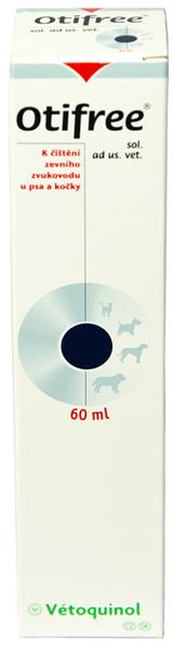 Roztok k čistění zevního zvukovodu u psů a koček. Otifree® roztok má schopnost intenzivně rozpouštět ušní maz a nečistoty, významně se tak rovněž snižuje počet bakterií a kvasinek přítomných v zevním zvukovodu. Otifree® roztok má schopnost intenzivně rozpouštět ušní maz a nečistoty, významně se tak rovněž snižuje počet bakterií a kvasinek přítomných v zevním zvukovodu. Díky vyváženému složení spolu s měsíčkem lékařským zabezpečuje přípravek normální strukturu a odolnost kůže. Současně nevysušuje a udržuje kůži vlhkou a vláčnou. Složení: Propylenglykol 40,0 g, emulgátor 5,0 g, extrakt z měsíčku lékařského (Calendula officinalis) 3,0 g, bazalkový olej 0,028 g, čištěná voda ad 100,0 ml. Cílové druhy: Psi a kočky. Dávkování: Do zevního zvukovodu 1x týdně, častější aplikace po konzultaci s veterinárním lékařem. Způsob použití: Naplnit zevní zvukovod roztokem, ohebnou část zvukovodu uchopte mezi palec a prsty a mírným tlakem směrem nahoru a dolů masírujte. Intenzita masáže se řídí citlivostí ucha. Tekutinu vysajte vatou, úplné vysušení zevního zvukovodu není nutné, jelikož uvolněné nečistoty z hlubších částí zevního zvukovodu odstraní již zvíře samo. Při neodborném čištění zevního zvukovodu vatovým tampónkem hrozí nebezpečí vzniku zánětu zvukovodu jeho poraněním nebo zatlačením ušního mazu do hloubky. Zvláštní upozornění: Přípravek nesmí být používán po uplynutí doby použitelnosti vyznačené na obalu. Uchovávejte mimo dohled a dosah dětí. Pouze pro zvířata. Balení: 60 ml.