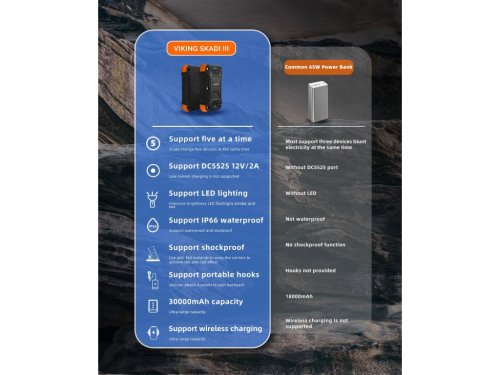 Outdoorová powerbanka Viking SKADI III Kapacita baterie 30000mAh/111Wh · Napětí baterie 3.7V · USB-C vstup PD60W max. · 2 x USB-A výstupy 18W max. · USB-C výstup PD65W max. · DC Jack výstup 24W max. · Wireless bezdrátové nabíjení 15W max. · Ochrana IP66 · SHOCKPROOF ochrana · Hmotnost 820g