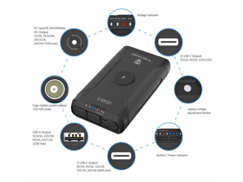Outdoorová powerbanka Viking VIDAR II • Kapacita: 72000mAh/266.4Wh • Maximální výkon: 180W • Zabudované LED světlo • Široká škála vstupů a výstupů (USB-A, USB-C, Cigaretová zásuvka, DC-jack, WIRELESS Qi) • Možnost solárního napájení • Funkce Pass-Through • Odolnost IP65