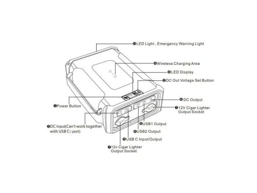Výstupy: • 2 x Cigaretová zásuvka: 12V/15A (max) • 2 x USB-A: 5V/3A, 9V/2A, 12V/1.5A (18 W max) • USB-C : 5V/3A, 9V/3A, 12V/3A, 15V/3A, 20V/3A (60 W max) • DC-JACK (5.5/2.1mm): 12/5A, 16.5V/4A, 20V/3.5A, 24V/3.5A (84 W max) • WIRELESS (Qi): 10 W