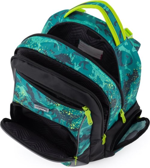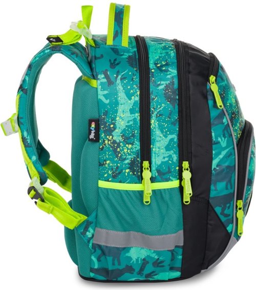 Detaily, které mají význam: Dvě vnitřní komory poskytují dostatek místa pro učebnice, sešity a osobní věci na volný čas. Odolné dno chrání obsah batohu před znečištěním zvenčí a zabraňuje prolití jakýchkoli tekutin uvnitř. Po stranách se nachází otevřená kapsa na láhev a malá kapsa na zip, které vám umožní rychlý přístup k drobnostem. Přední kapsa je vhodná na svačinový box a menší kapsička na drobnosti, obě jsou opatřeny zipem.