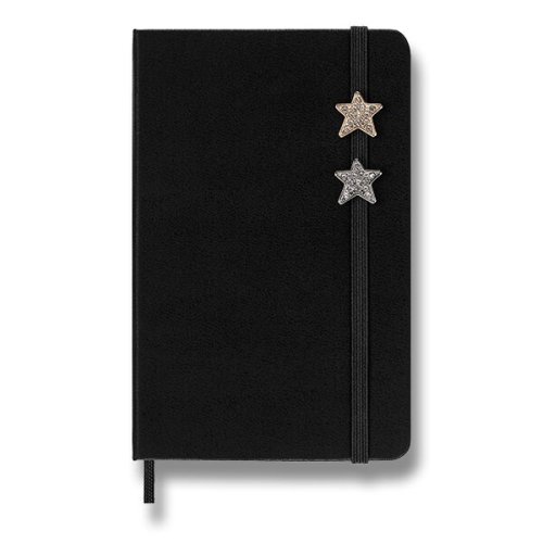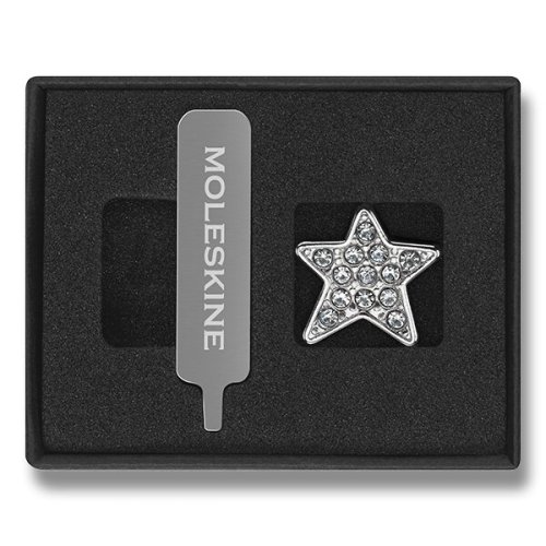 Balení obsahuje:, - ozdobu, - kovový šroubek pro upevnění symbolu ke gumičce zápisníku, - speciální šroubovák, - návod k použití (v anglickém jazyce), Vyrobeno ze slitiny zinku., [https://www.moleskine.com/dw/image/v2/BFRN_PRD/on/demandware.static/-/Sites-masterCatalog_Moleskine/default/dw3cbd5904/images/lifestyle/pins_mood_02.jpg?sw=328&sh=328]