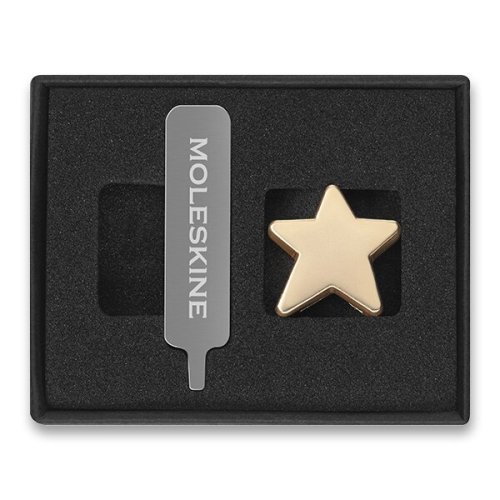 Balení obsahuje:, - ozdobu, - kovový šroubek pro upevnění symbolu ke gumičce zápisníku, - speciální šroubovák, - návod k použití (v anglickém jazyce), Vyrobeno ze slitiny zinku., [https://www.moleskine.com/dw/image/v2/BFRN_PRD/on/demandware.static/-/Sites-masterCatalog_Moleskine/default/dw3cbd5904/images/lifestyle/pins_mood_02.jpg?sw=328&sh=328]