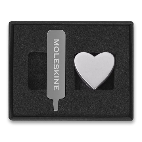 Balení obsahuje:, - ozdobu, - kovový šroubek pro upevnění symbolu ke gumičce zápisníku, - speciální šroubovák, - návod k použití (v anglickém jazyce), Vyrobeno ze slitiny zinku., [https://www.moleskine.com/dw/image/v2/BFRN_PRD/on/demandware.static/-/Sites-masterCatalog_Moleskine/default/dw3cbd5904/images/lifestyle/pins_mood_02.jpg?sw=328&sh=328]